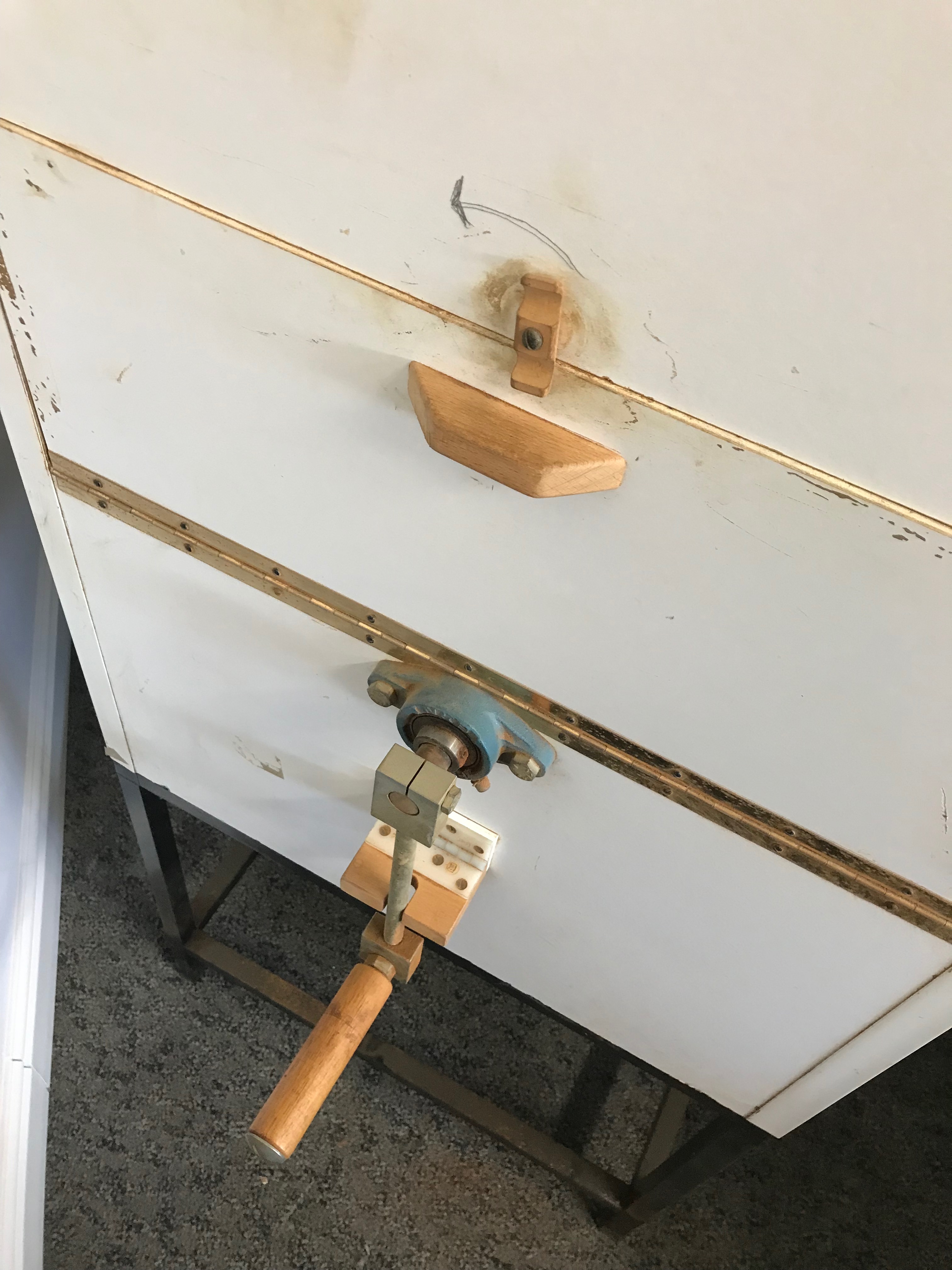 The box was originally constructed by Art Equipment Ltd in Northampton and was used by David for many years in his Intaglio print-making. It is solid and in good working order.